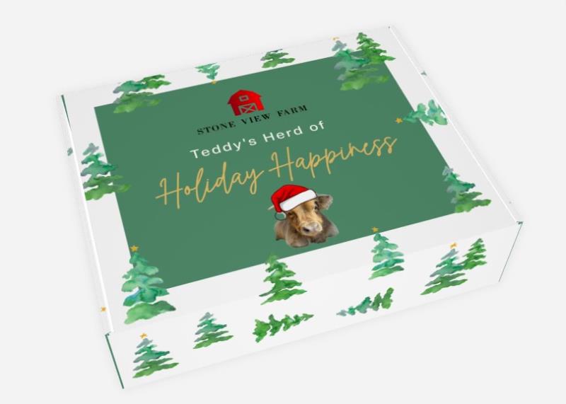 $50- Holiday Crate Box filled with a Santa Highland stuffie, a holiday cookie, Highland Herd Sticker, a cow tale, Holiday HERD t-shirt and a special letter from Teddy Claus