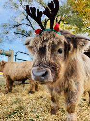$30- Holiday Crate Box filled with a Santa Highland stuffie, a holiday cookie, a Highland Herd sticker, a cow tale, and a special letter from Teddy Claus